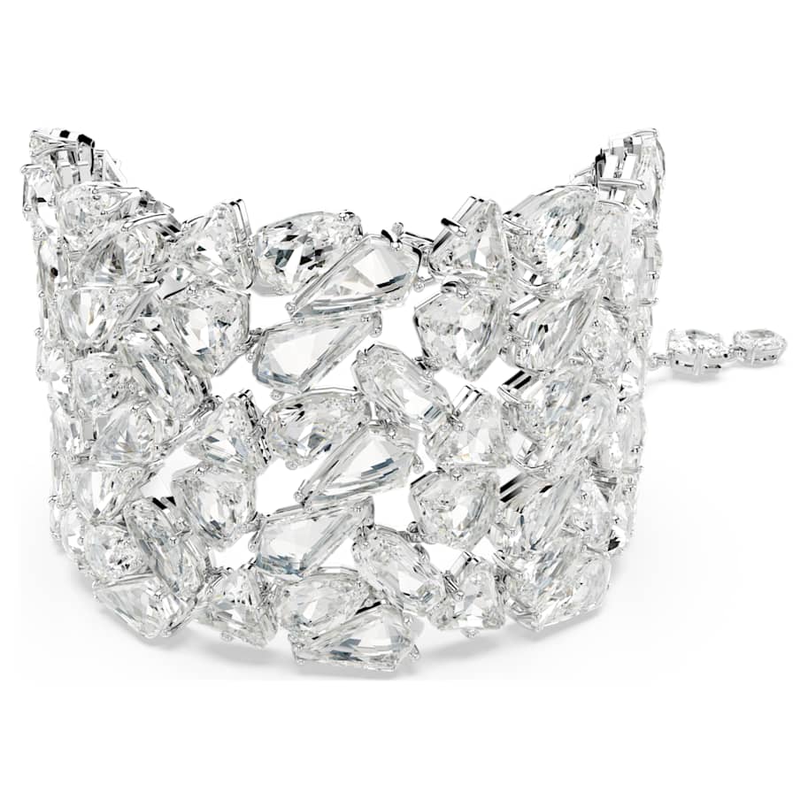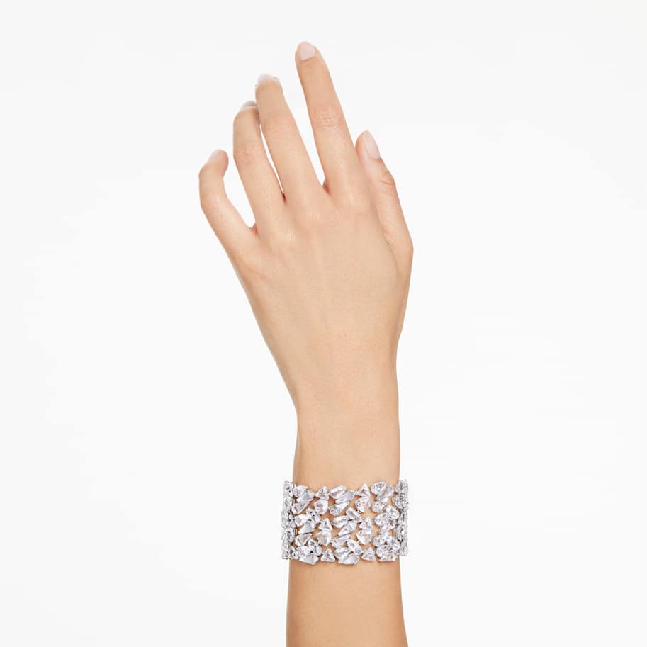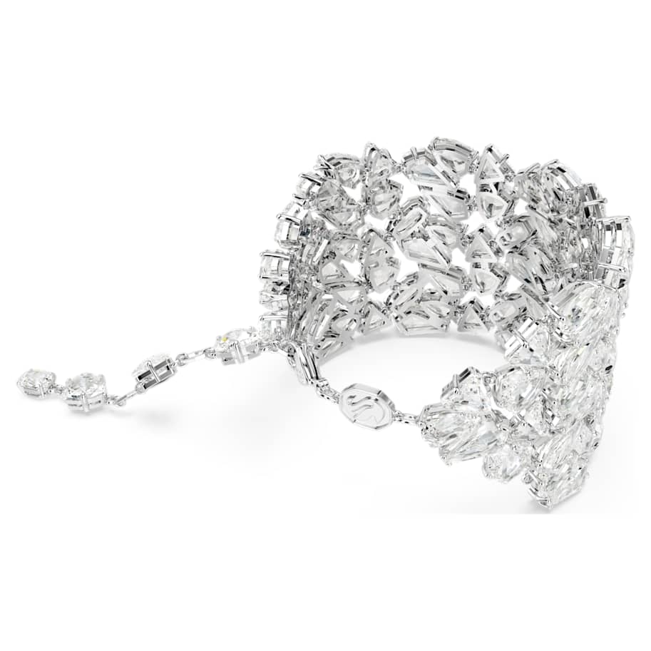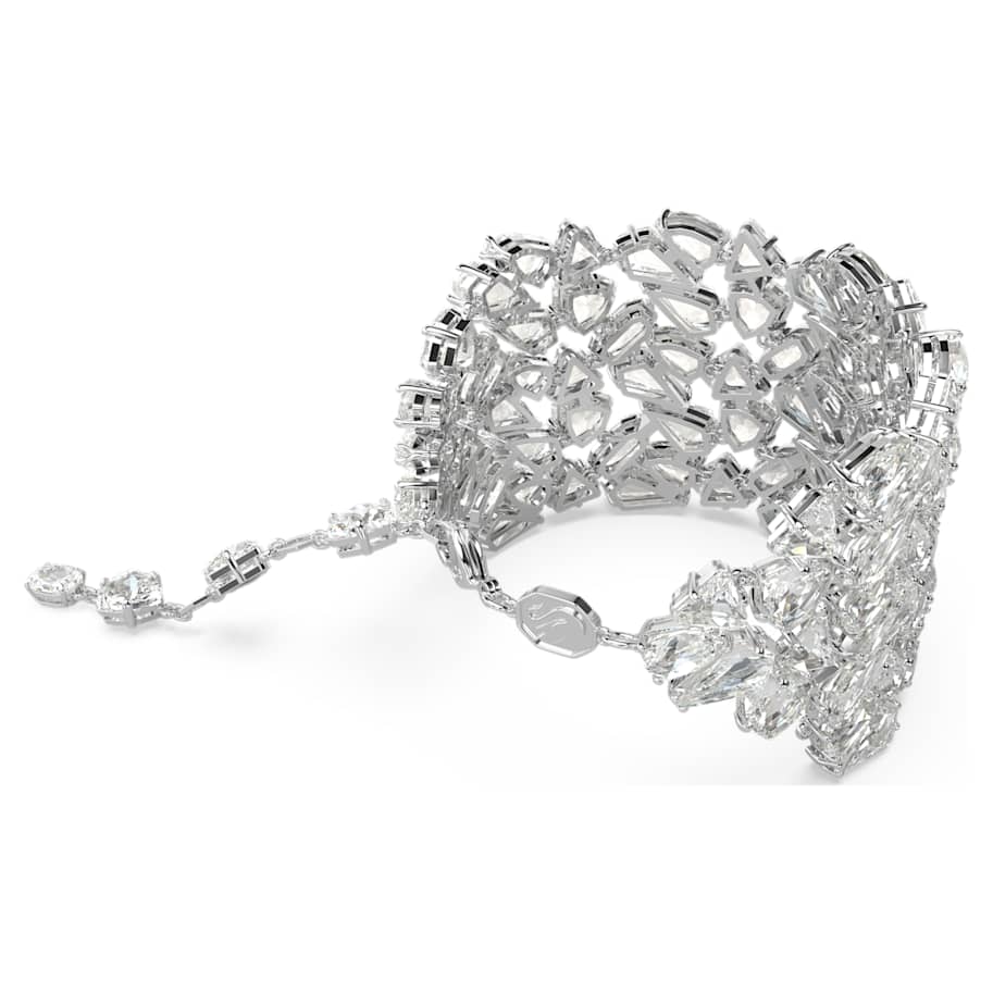 This extraordinary Mesmera bracelet is a statement piece that will instantly elevate your evening style. The bold design is rhodium plated and features an eye-catching cluster of crystals in a dramatic variety of cuts. For added luxury, the hanging elongation includes individual Swarovski Zirconia between each octagonal link. With so many facets on display, this piece catches the light from every angle. Choose this bracelet as the ultimate expression of refinement.