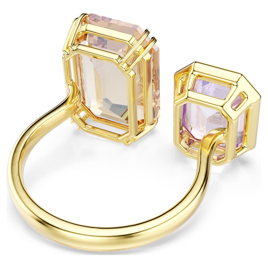 This asymmetrical cocktail ring is certain to become a new favorite in your jewelry collection. The open gold-tone plated band features a bezel-set purple crystal on one side, and a caramel crystal on the other side in a double prong setting. Wear it as a standalone piece or stacked with other rings from the Millenia family for a flawless take on modern elegance.