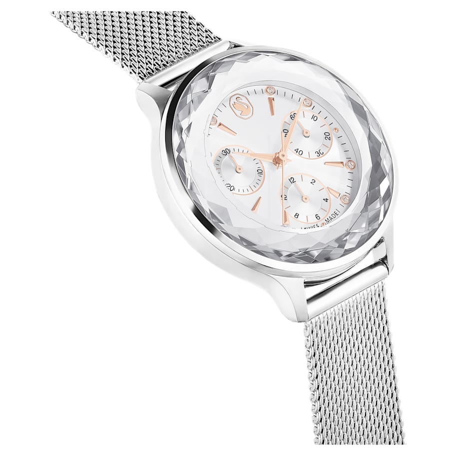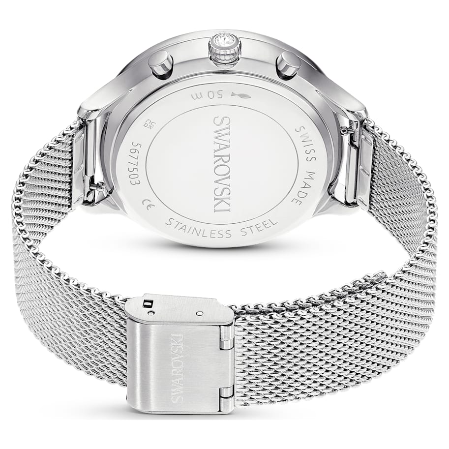 Epitomizing sports luxe style, this Nova watch is meticulously crafted to highlight Swarovski’s mastery of design. The 37mm stainless steel case is seamlessly integrated with a beautifully faceted crystal bezel, as well as the watch’s sapphire glass. This frames the radiant sunray dial, which is adorned with a swan logo, crystal index markers, and three subdials including a minutes counter, seconds counter, and hours counter. Around the wrist, this modern timepiece is worn on a quick-release Milanese bracelet. The rose gold-tone hands are coated in Luminova for added brilliance. This Swiss made watch is water resistant to 50 meters, with a single crystal set in the crown, and is a versatile choice for both work and play.