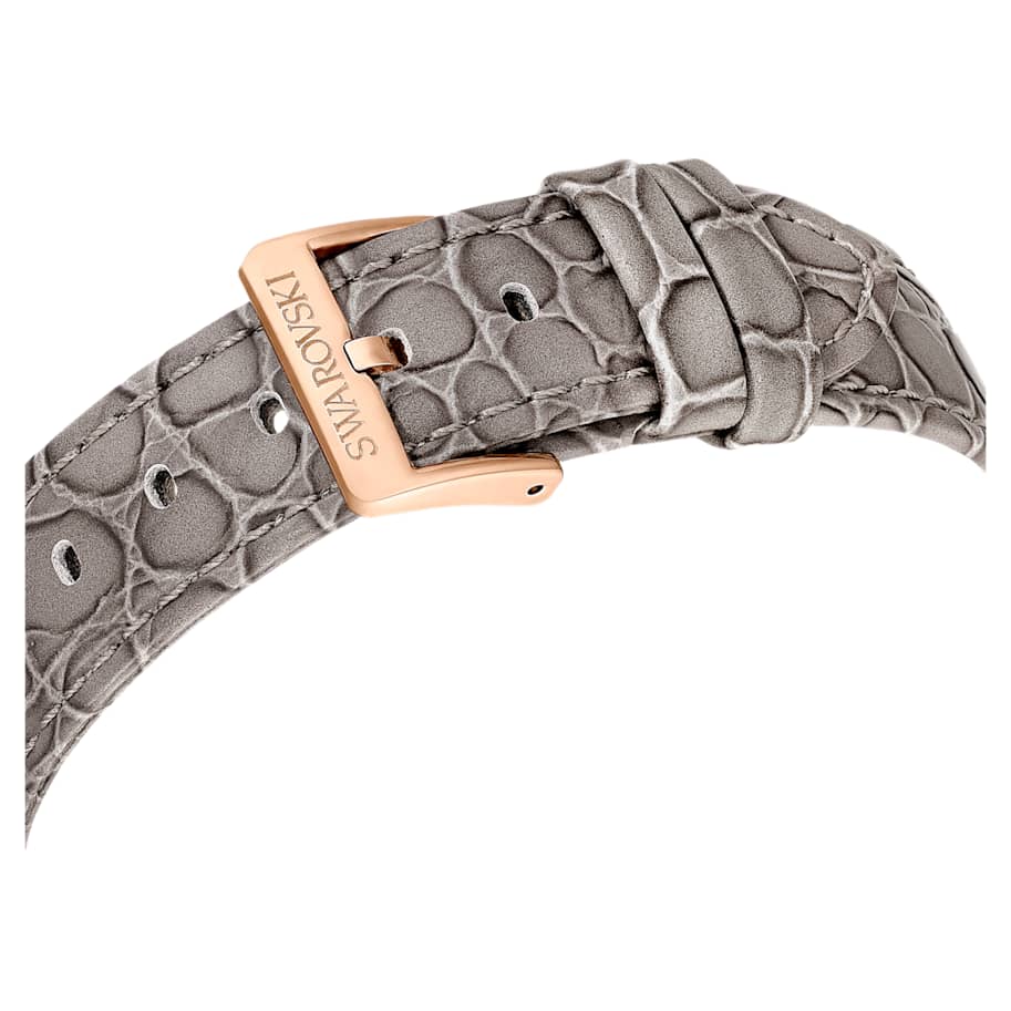 This brown chronograph watch delivers a perfect fusion of watchmaking expertise and Swarovski savoir-faire. The round 37mm case is made with a rose gold-tone finish and features a crystallized bezel, which is neatly faceted and accompanied by a circle of clear pavé. Beneath the mineral glass, the guilloché dial features a swan logo at 12 o’clock, LumiNova coated hands, and three chronograph counters for separate measurements of hours, minutes, and seconds. There are also six clear crystals used for the indexes and a single crystal placed in the watch’s crown. This Swiss made watch is water resistant to 50m and is worn on a quick-release Italian calfskin leather strap in brown with an embossed crocodile pattern.