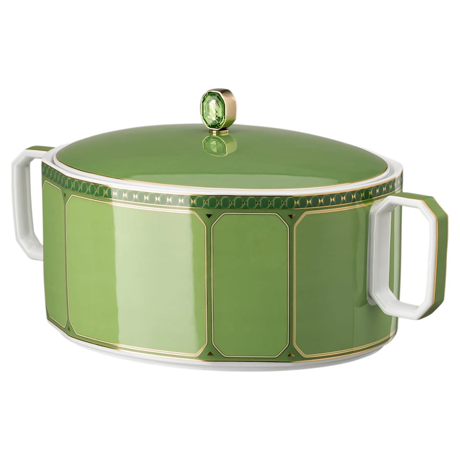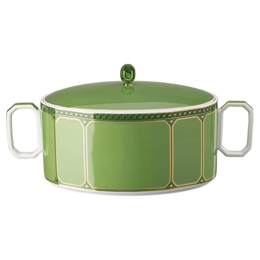 Create theatre at the table with this vibrant green serving bowl, designed in collaboration with porcelain brand Rosenthal. Featuring artful octagonal handles and a swan-engraved octagon-cut crystal on the lid, this is a special centerpiece for coming together and making memories. The bowl is dishwasher safe, however the lid should be hand cleaned. Usage in the microwave is not recommended.