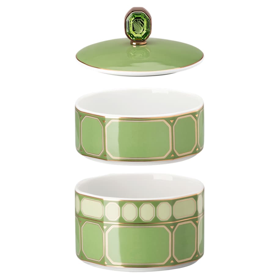 This bijou Signum box offers a stunning storage solution. The three-piece design is crafted from porcelain and features a green geometric pattern inspired by Swarovski’s signature octagon. Inside, the box is comprised of two levels, while the lid is topped with a single octagon-cut crystal in green. This box was created in partnership with porcelain brand Rosenthal. Do not use in the dishwasher or microwave.