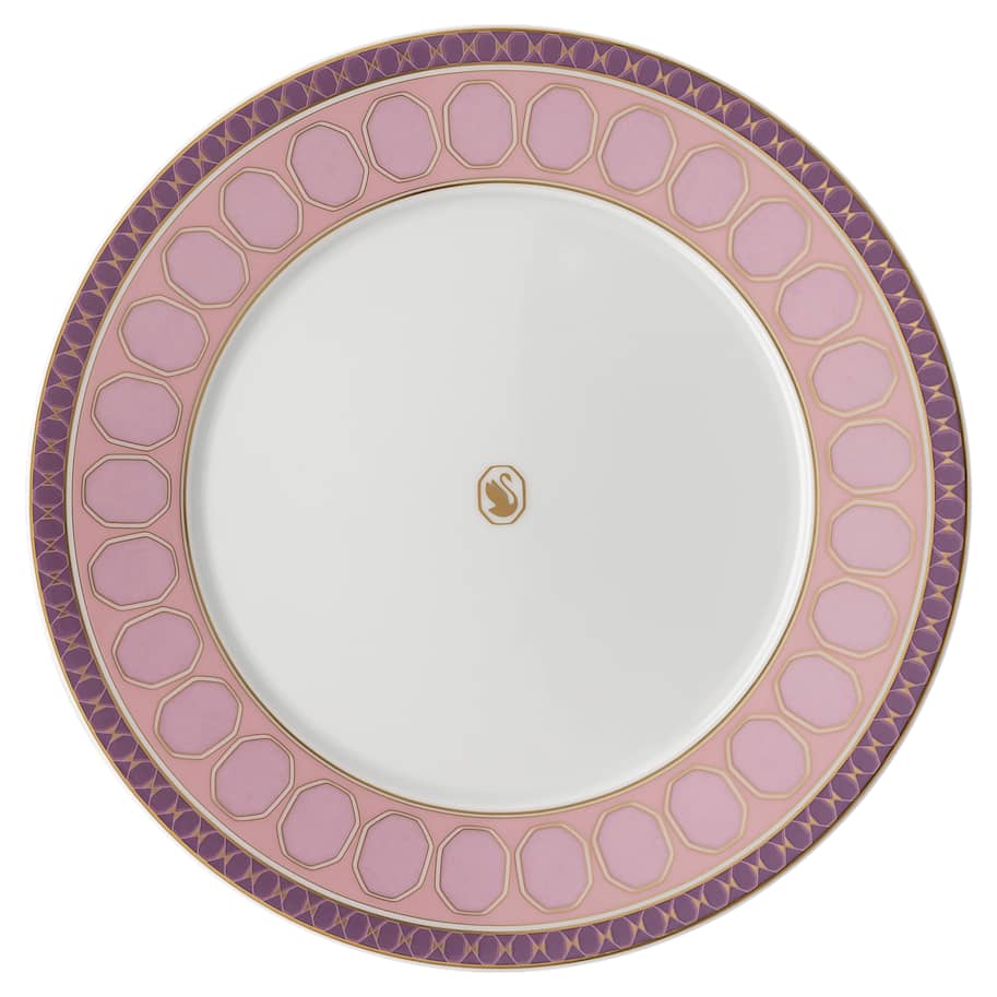 Add joy to any tablescape with this pretty pink plate inspired by the Wiener Werkstätte art scene. The mesmerizing geometric motif features Swarovski's signature octagon with the iconic swan logo at the center in golden tone. Style with other colorful pieces from the Signum collection for maximum impact. This plate is part of a collaboration with porcelain brand Rosenthal. It is dishwasher safe.
