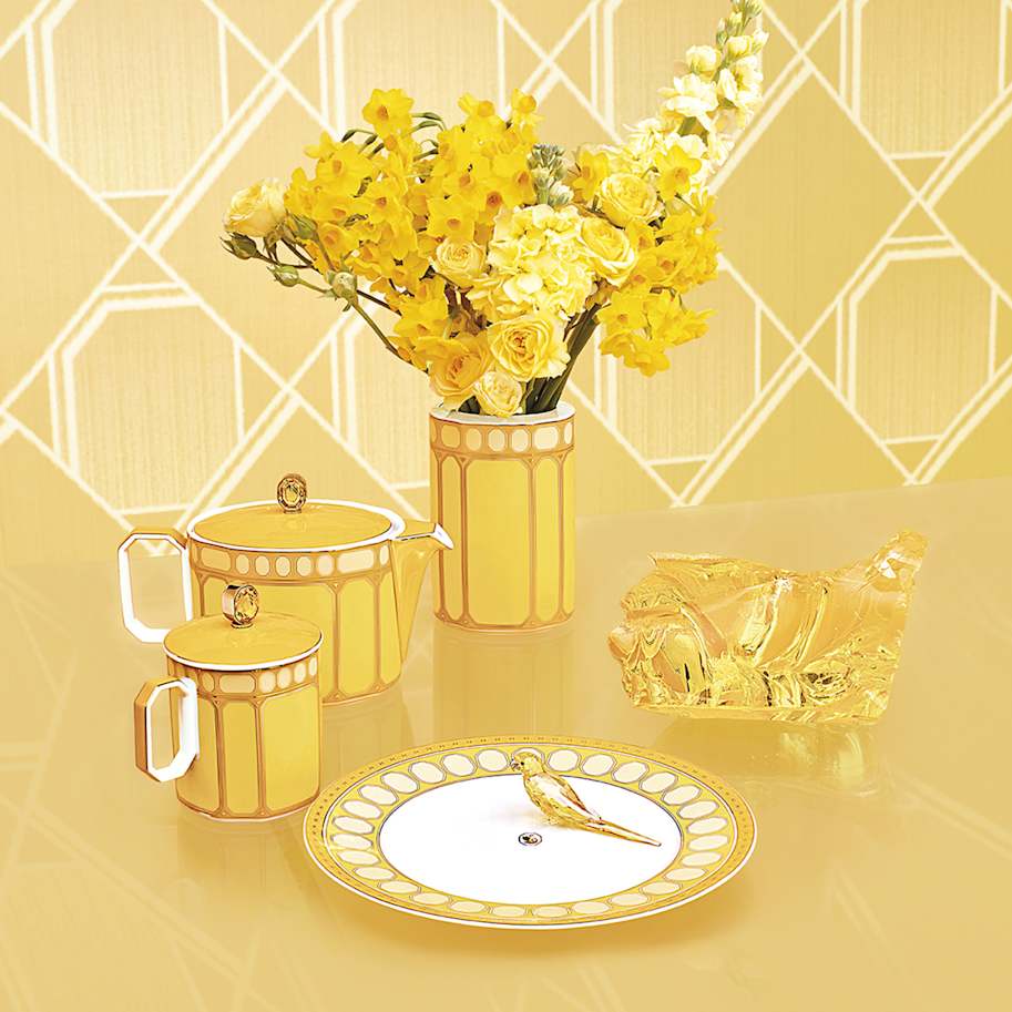 Turn teatime into an art with this mug inspired by the Wiener Werkstätte art movement. Designed in collaboration with porcelain brand Rosenthal, it marries clean lines with playful features, including Swarovski's signature octagon in a bright yellow motif, a stylish handle and a crystal-topped lid. Create your own set with mugs in different colors. The mug is dishwasher safe, however the lid should be hand cleaned. Usage in the microwave is not recommended.