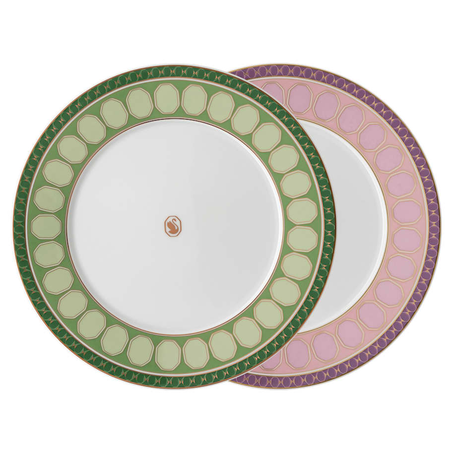 Create a feast of wonder with this pink and green plate set. Inspired by the Wiener Werkstätte art scene, the mesmerizing geometric motif features Swarovski's signature octagon with the iconic swan logo at the center in gold tone. Set the table with other colorful pieces from the Signum collection for maximum impact. This plate set is part of an exclusive collaboration with porcelain brand Rosenthal. It is dishwasher safe, however usage in the microwave is not recommended.