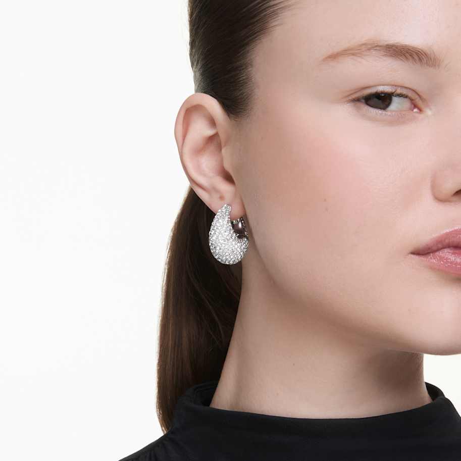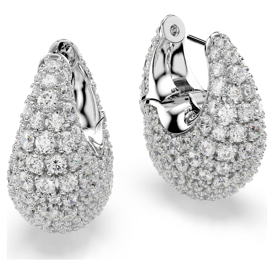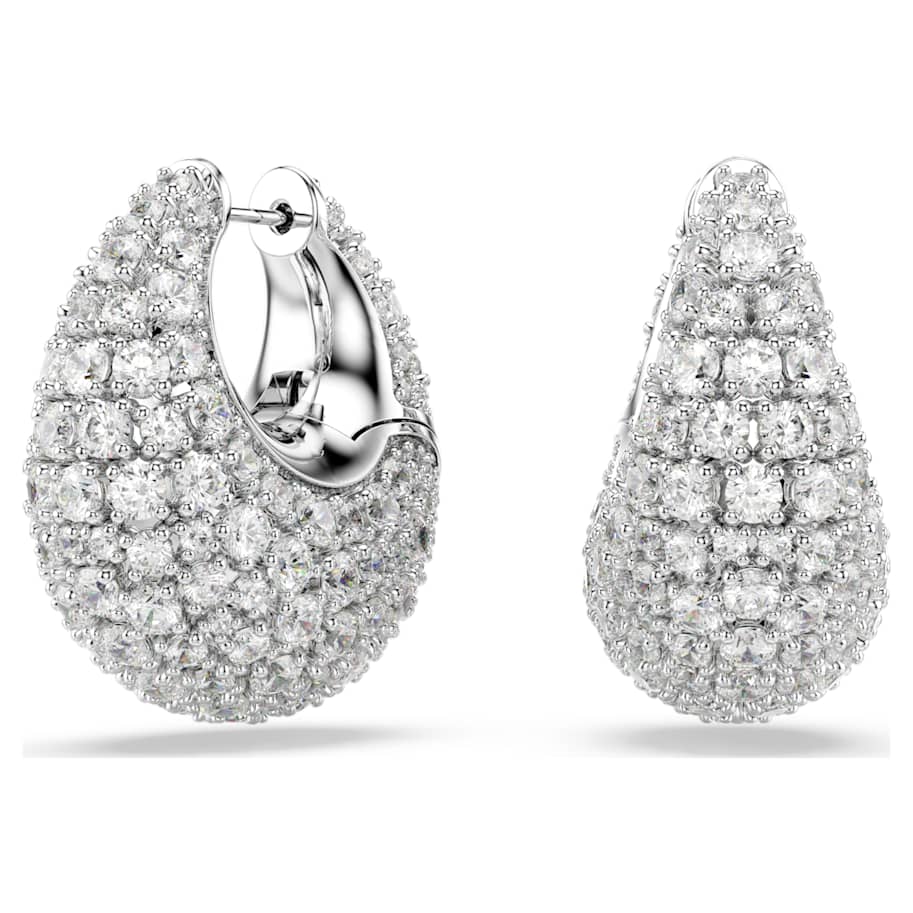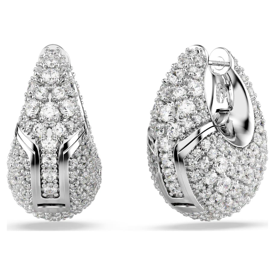 Crafted in the shape of two shimmering droplets, these large earrings are a glamorous choice for personal styling. Each rhodium plated silhouette features a stunning decoration of clear Swarovski Zirconia, set in place using the chatonnage technique. An additional spring plate mechanism makes these earrings particularly easy to wear. Combine them with a wondrous Sublima pendant or a ring to infuse your entire look with light.