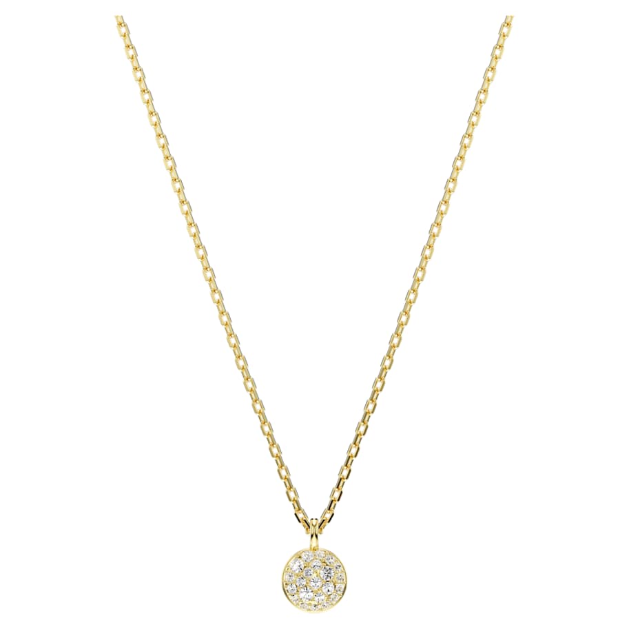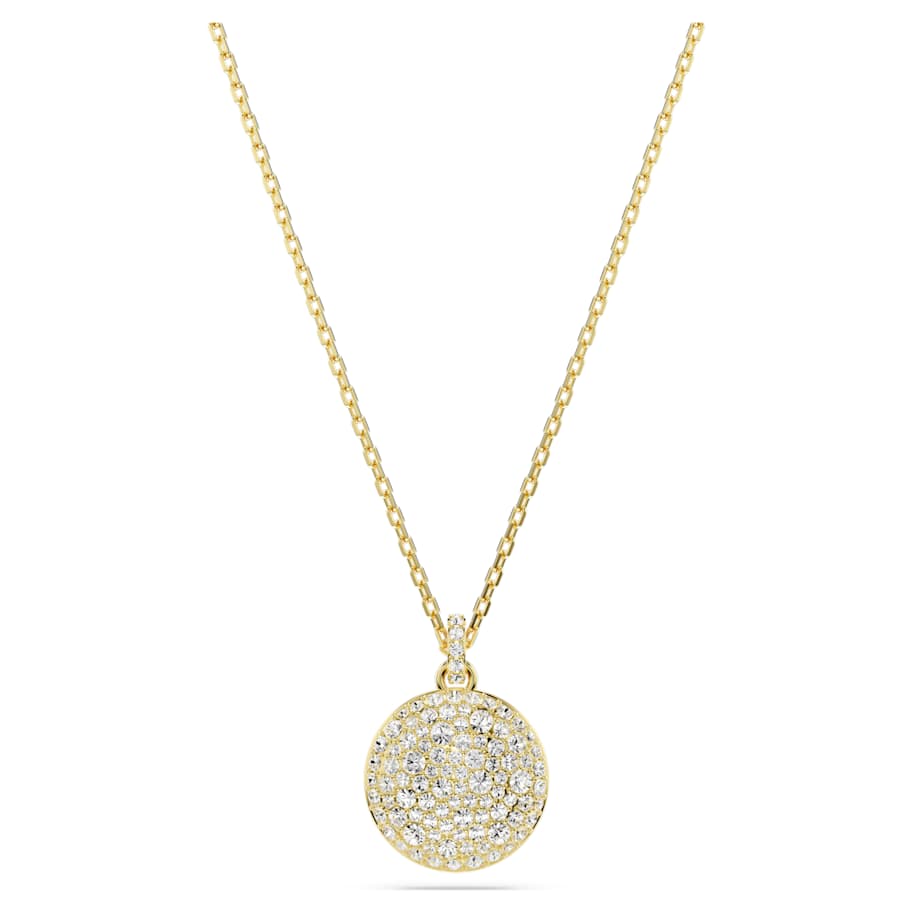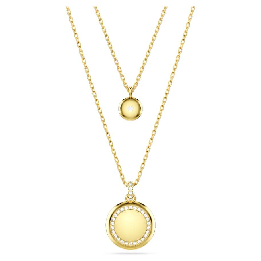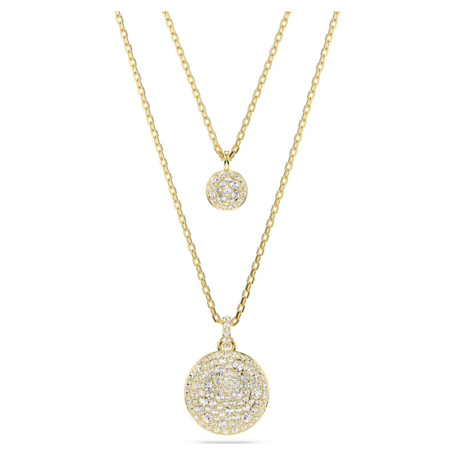This shimmering layered pendant is the ideal way to fill your style with light. The gold-tone plated design features two chains, each with a domed meteor motif that is beautifully adorned with a snow pavé of clear round crystals in different sizes. For extra versatility, the pendant can be reversed, revealing a halo of crystals around the larger motif, and a single crystal at the center of the smaller motif. A wondrous gift for yourself or a loved one.