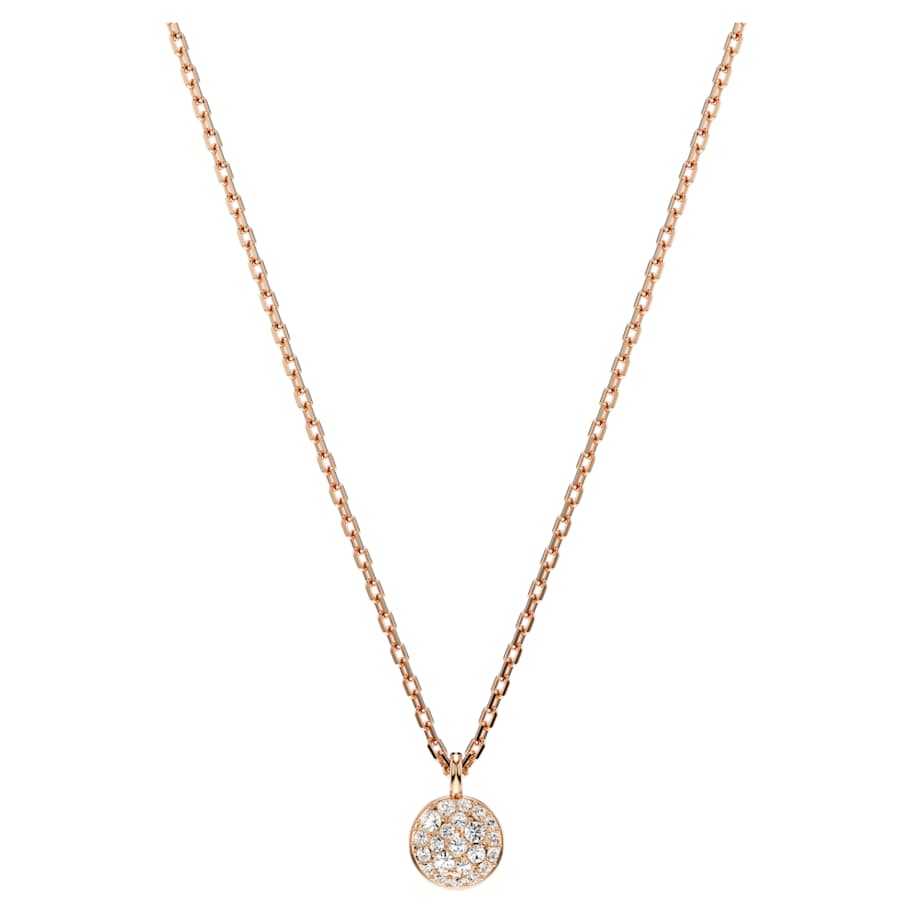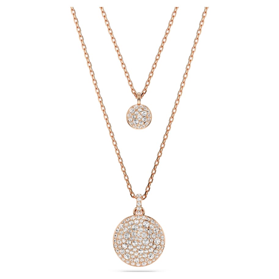 This shimmering layered pendant is the ideal way to fill your style with light. The rose gold-tone plated design features two chains, each with a domed meteor motif that is beautifully adorned with a snow pavé of clear round crystals in different sizes. For extra versatility, the pendant can be reversed, revealing a halo of crystals around the larger motif, and a single crystal at the center of the smaller motif. A wondrous gift for yourself or a loved one.