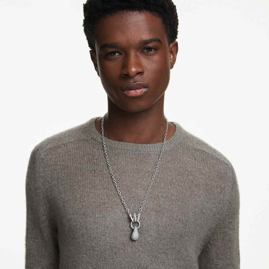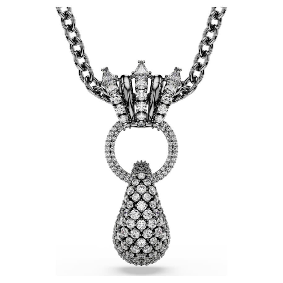 This scintillating pendant is designed with three unique elements, revealing expressivity in every detail. Worn on a long chain, the ruthenium plated design includes metallic spirals with round and spiky Swarovski Zirconia, a central hoop, and a large droplet at the center that showcases the chatonnage technique. It’s a bold way to style yourself for everyday occasions.