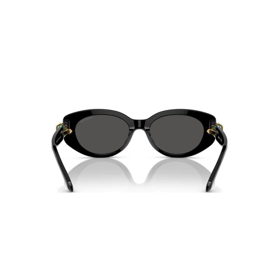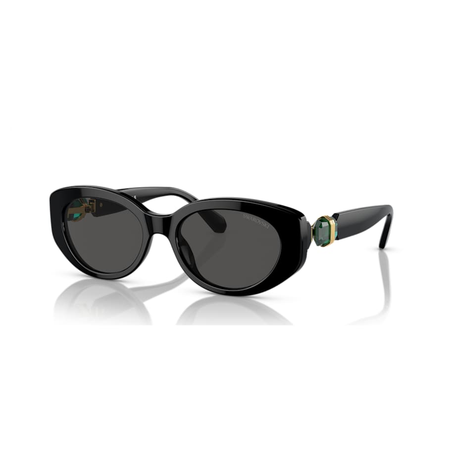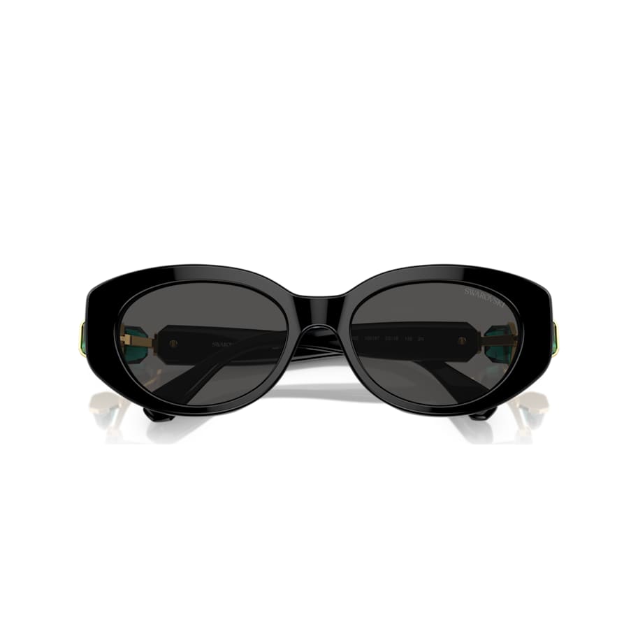 Inspired by our bold Lucent family, these cat-eye sunglasses are statement chic. The frames are crafted from black acetate and feature black lenses and hinged octagon-cut green crystals on each temple. Gold-tone accents around the stones elevate the luxury. Add this classic look to your wardrobe and face the day in style.