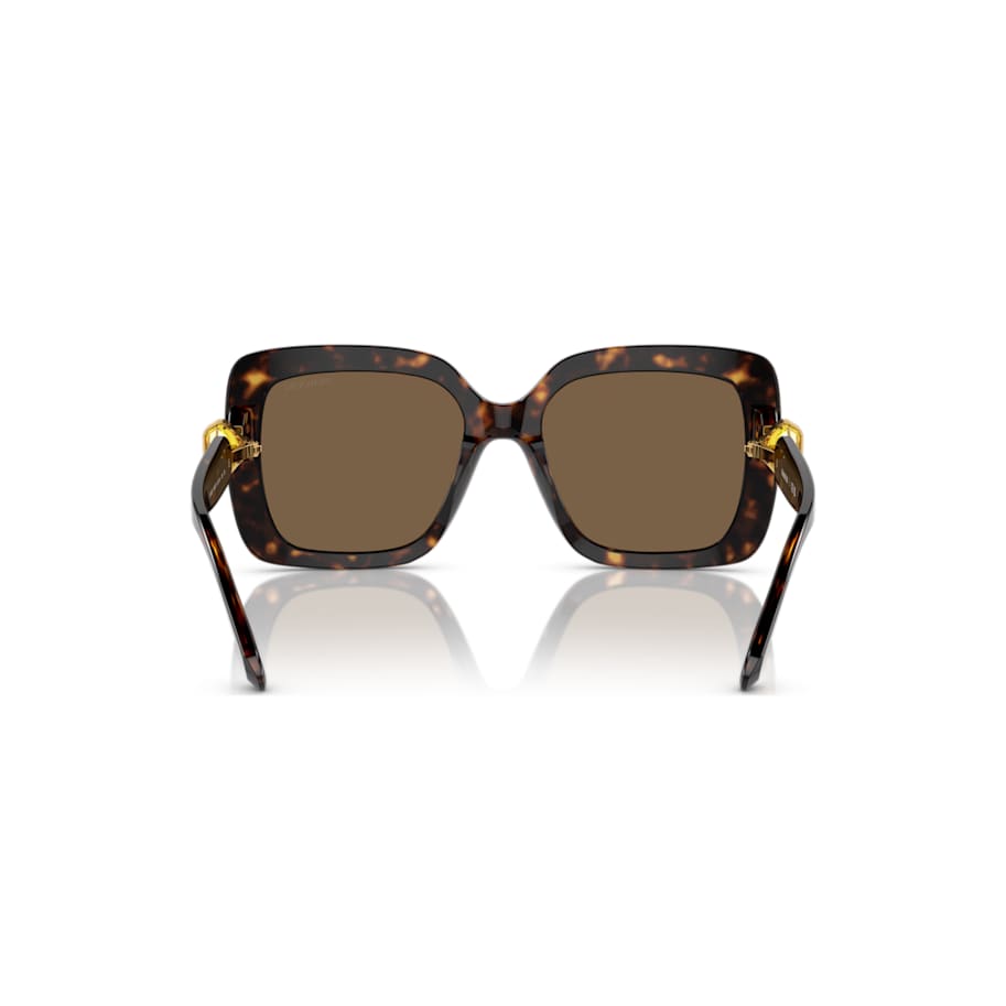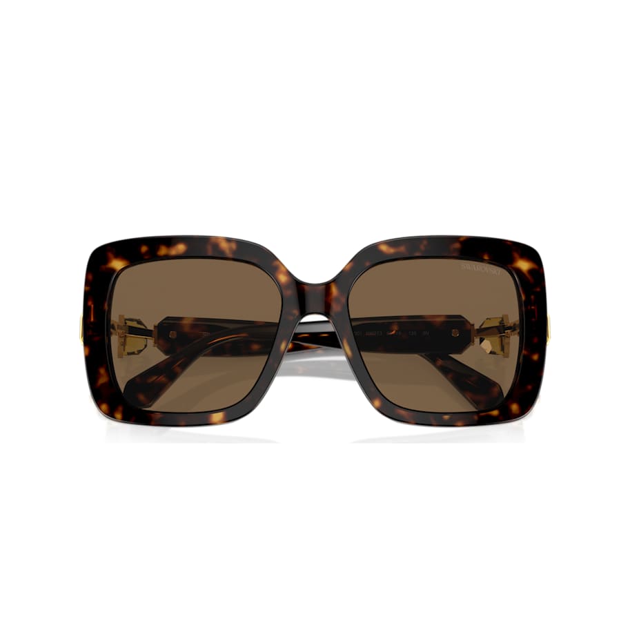 Go for a look of exaggerated chic with these wondrous square-shape sunglasses. The design is inspired by our bold Lucent family and features Havana acetate frames with brown lenses and hinged octagon-cut yellow crystals on each temple. Gold-tone accents around the stones elevate the luxury. Add this audacious look to your wardrobe and face the day with confidence.