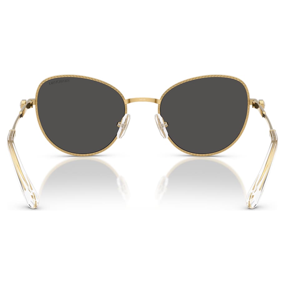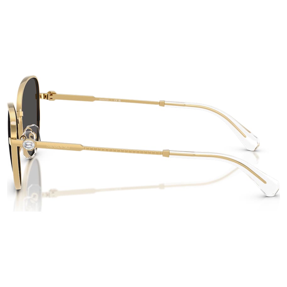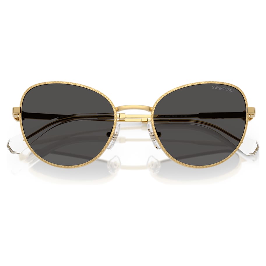 Crafted with luxurious gold-tone metal, these oversized Swarovski sunglasses will infuse your style with pure radiance. The cat-eye shaped frames are slim and classic, and feature octagonal engravings on the front and temples, in celebration of Swarovski’s emblematic brand shape. A small octagon-shaped crystal is also elegantly set on each temple for light-catching joy. Inspired by the Millenia family, this is a perfect pair for wearing alongside matching jewelry.
