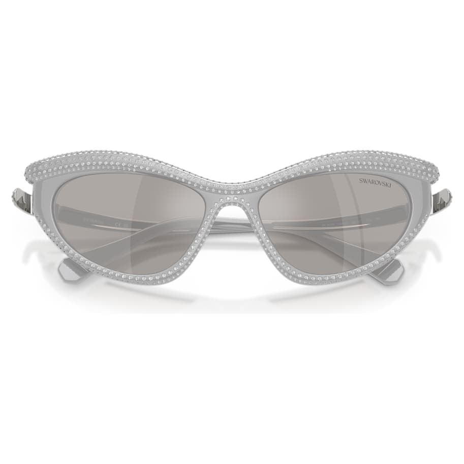 Futuristic and edgy, these statement sunglasses are inspired by the Sublima jewelry family. The expressive silhouette is defined by light gray frames in a cat-eye shape, with clear round crystals in different sizes, and metal temples that are enriched with radiant pavé. The mirrored silver lenses complete the modern look, giving you a shimmering way to accessorize with Swarovski savoir-faire.