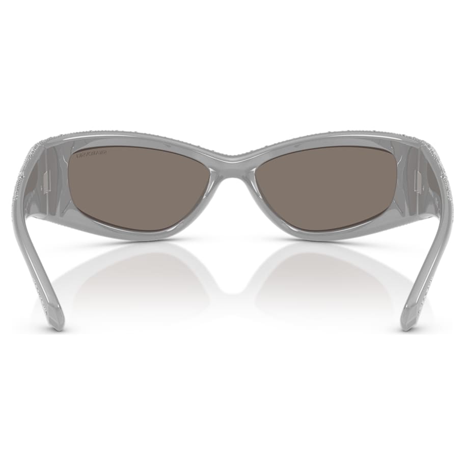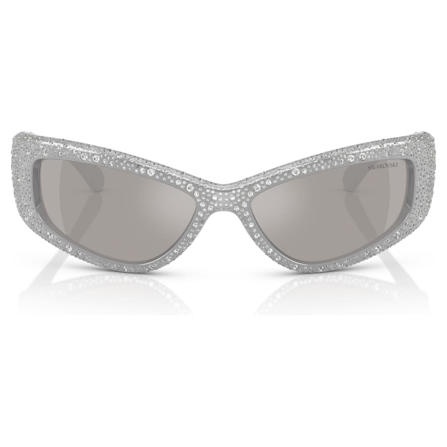 Sleek, stylish, and showcasing the season’s most distinctive style, these Sublima-inspired sunglasses are crafted with irregular wraparound frames in silver-tone acetate. Around 1,760 clear crystals in three different sizes cover the entire surface, positioned by hand in a Meteora pattern in a refined pavé effect that shimmers from every angle. Completed with dark gray lenses, these striking sunglasses will transform your everyday looks.