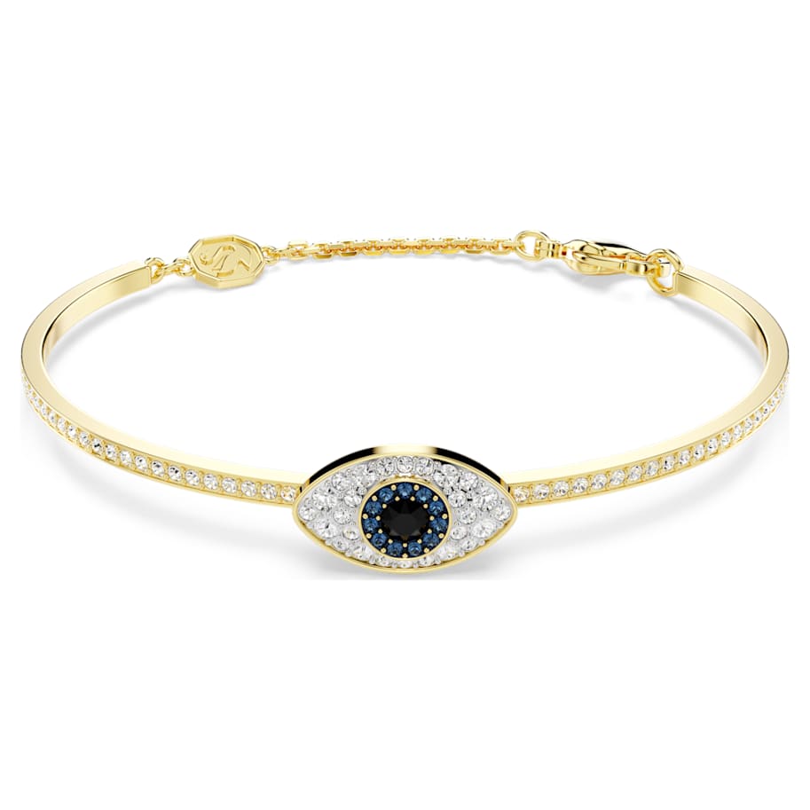 Dress yourself in positivity with this Symbolica bangle. The gold-tone plated jewelry features a pavé band with a domed evil eye at its center, embellished with clear, blue, and black pavé. The soft closure ensures an easy and comfortable fit around the wrist. Wear this piece to welcome good energy every day.