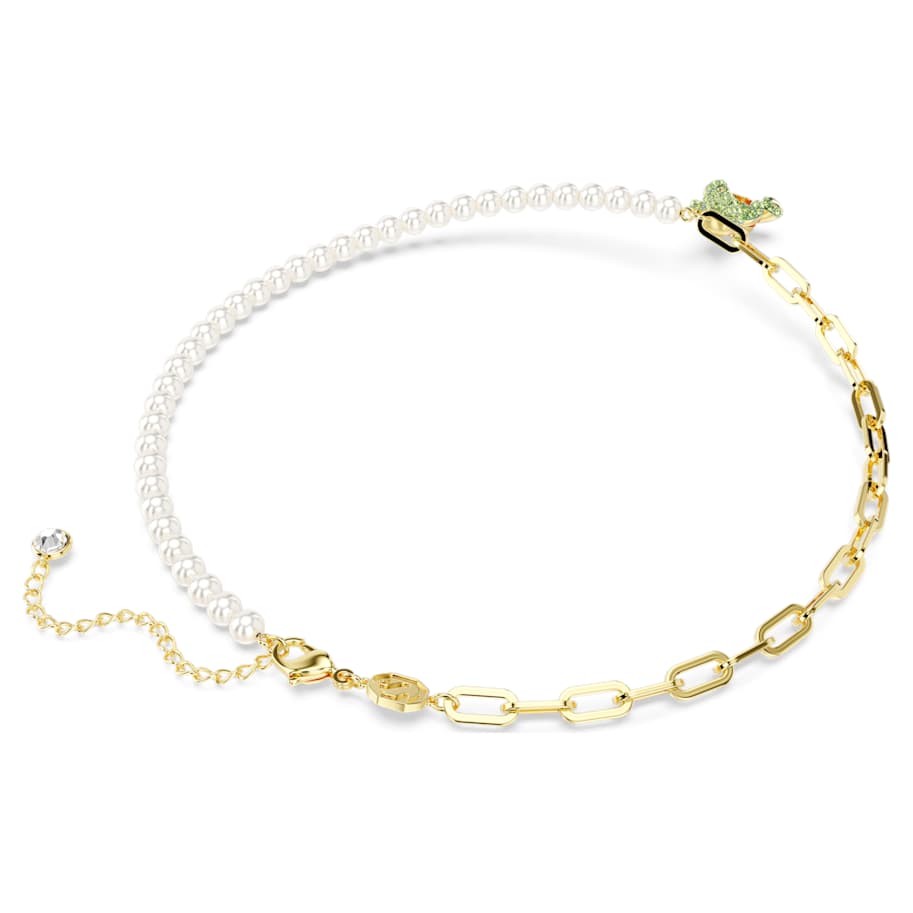 Raise a smile with this playful teddy bear pendant. The heart-warming design is worn on a necklace of Swarovski Crystal Pearls and a gold-tone plated chain with a teddy motif embellished with green crystals. At its center, the teddy holds a yellow Swarovski Zirconia dancing stone that provides constant light-catching motion. Wear yours with a matching bracelet to complete the set.