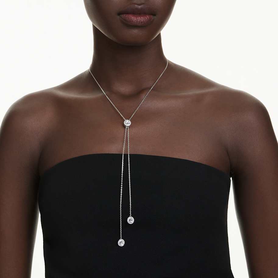 Embrace the versatility of this elegant Y-shape pendant. The rhodium plated chain features a sliding mechanism for an easily adjustable fit and is adorned with three double-sided motifs. Simply reverse the jewelry to showcase a different display of round-cut crystals. Mix and match with other Una Angelic pieces for a look of ultimate radiance.