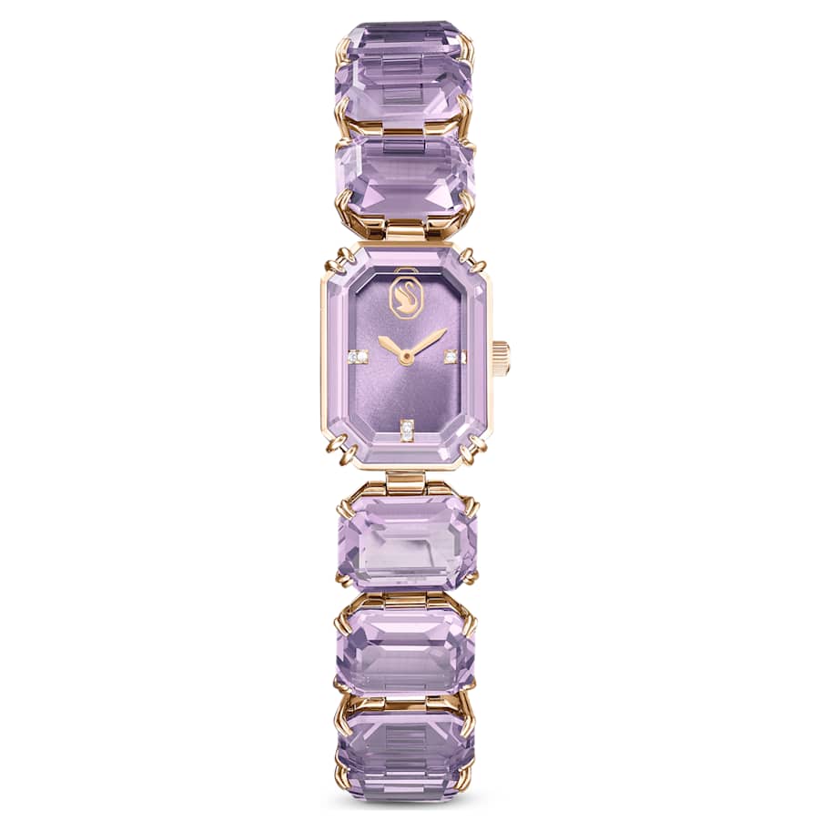 Inspired by the Millenia jewelry family, this candy-colored watch offers sensational wrist appeal. Crafted with a champagne gold-tone finish, the bracelet is expertly crafted with a row of octagon-cut crystals in a purple hue, connecting to an octagon-shape case with a sunray purple dial. Three clear crystals are used for hour markers, along with an additional crystal in the crown, while the Swan logo sits elegantly at 6 o’clock. This Swiss Made watch is water resistant to 50m and offers a playful choice for solo styling or layering.