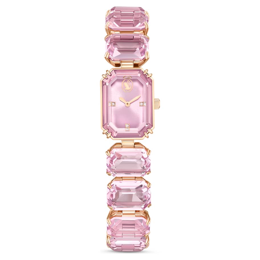 Inspired by the Millenia family, this eye-catching bracelet watch delivers color pop appeal. Expertly crafted from a row of octagon-cut crystals in a vibrant pink hue, it features a pink dial, a crystallized bezel, and a rose gold-tone finish. It is water resistant to 50m and makes a playful choice for solo styling or layering.